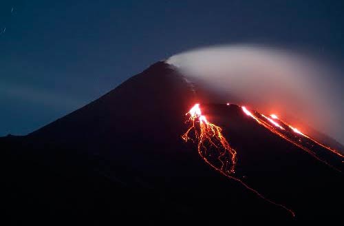 Esa acción levanta una fuente incandescente sobre el cráter de aproximadamente 300 metros de altura, alimentando las coladas de lava que alcanzan el flanco suroeste a 500 metros de longitud, explica un reporte de la Conred.