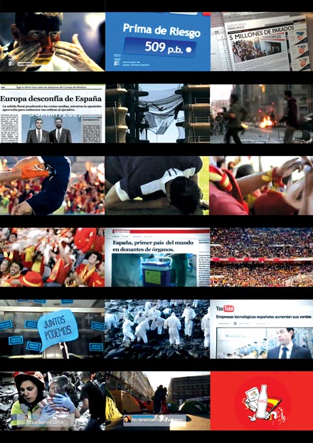 Vuelve el cántico, empieza el partido y comienza otra serie de imágenes heterogéneas por forma, valores y contenido: “España, primer país del mundo en donantes de órganos”, anuncia otra web: “Juntos podemos” en una pancarta escrita a mano, la primera que hace el guiño al lenguaje usado en las manifestaciones del 15M. Luego, unos pescadores (un sector con bastantes problemas); un niño que escribe (un acto que probablemente en unos diez años será reservado sólo a quien tenga un tío cura); uno de los muchos trenes inaugurados en los últimos años para no ir a ninguna parte; imágenes de archivo de los voluntarios del tiempo del Prestige; un vídeo de Youtube donde un prenda nos anuncia que las “empresas tecnológicas españolas aumentan sus ventas” (deslocalizando en China, debería añadir); lacitos colorados de distintas asociaciones benéficas; un cartel para donantes de sangre; un “Todos somos Lorca” (a lo mejor referido también al poeta)escrito con el estilo gráfico de una conocida red social; y voluntarios de la Cruz Roja que dan paso al “desastre” que ha generado el debate: el uso publicitario de las manifestaciones de plaza, lo que Carlos Taibo ha definido “Iconografía seudo15M”.