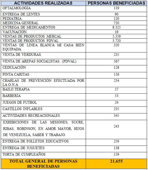 Indico el General de Brigada Javier Armando Molina, Comandante de la ADI 211, que en la realización de esta actividad, se logro brindar a (21.655) habitantes una atención digna, Integral, Humana e incondicional, de igual manera elevar la calidad de vida en todas las comunidades que hacen vida en la Jurisdicción de esta Unidad Superior, así mismo se celebró el Cumpleaños de Nuestro Máximo Líder de la Revolución Hugo Rafael Chávez Frías, Presidente Constitucional de la Republica Bolivariana de Venezuela, así como también “el fortalecimiento y acercamiento de la Fuerza Armada Nacional Bolivariana a nuestro Glorioso Pueblo de Venezolano”. Finalizo