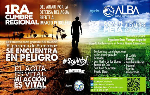 Según el informe de los organizadores este sábado en Cubarral será la primera cumbre regional de la cuenca del Rio Ariari por la defensa del agua frente al impacto petrolero, para que en este verano no se repitan las imágenes en esta región de animales muertos por falta del vital líquido. El encuentro es el despertar de Cubarral y el departamento del Meta ante la política extractiva inconsulta. Por ello se ha invitado igualmente a los habitantes y líderes de la localidad de Sumapaz en el Distrito Capital, ya que allí se encuentra el Páramo de Sumapaz, el cual es el más grande del mundo, la mayor fábrica de agua dulce en el planeta, en este se originan los ríos más importantes de nuestra Orinoquía. El Páramo de Sumapaz se encuentra en riesgo por las pésimas políticas minero-energéticas del Gobierno Nacional.