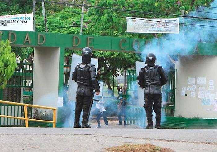 El territorio universitario ha sido violado por parte del ESMAD en varias ocasiones con resultados lamentables para las personas y las instalaciones. La situación de libre albedrío y de desafuero de elementos de organismos de seguridad es avalada por lasautoridades universitarias y por su rectora Alba Durango Villadiego, decisión que adopta en acuerdo con el gobernador de Córdoba, Alejandro Lyons, y con el alcalde de Montería, Carlos Correa. Eso hace tan delicada la situación y es caldo de cultivo para que sucedan hechos bochornosos como el protagonizado en días anteriores por el cabo del Ejército, Leonardo Páez, quien ingresó en un arranque de celos a la Universidad de Córdoba, usando el uniforme y arma de dotación con el fin de reclamarle a un estudiante quien, al parecer, sostenía una relación sentimentalcon su novia, entró el militar a arreglar un lío de faldas y fue retenido porlos estudiantes. Al tiempo se presentan en la universidad unas amenazas contra líderes estudiantiles y sindicales, constituyéndose en aspectos adversos a lo sería el proceso de reparación colectiva en la que se encuentra la institución, a partir de la Ley de Víctimas.