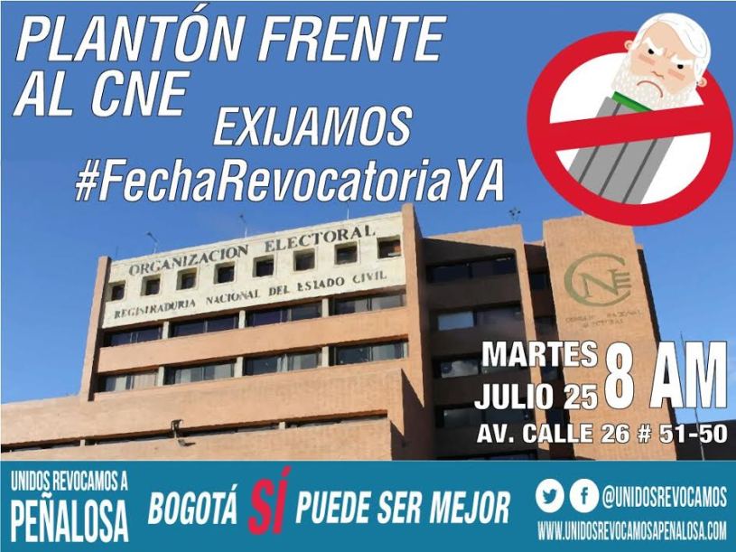 La campaña Unidos Revocamos a Peñalosa, invita a la ciudadanía bogotana a participar hoy martes 25 de julio en el plantón frente a las instalaciones del Consejo Nacional Electoral CNE, en la Avenida Calle 26 No. 51-50, Bogotá, para exigir que este organismo defina la fecha de la revocatoria luego que la Registraduría Distrital avalara las firmas recolectadas en meses anteriores.