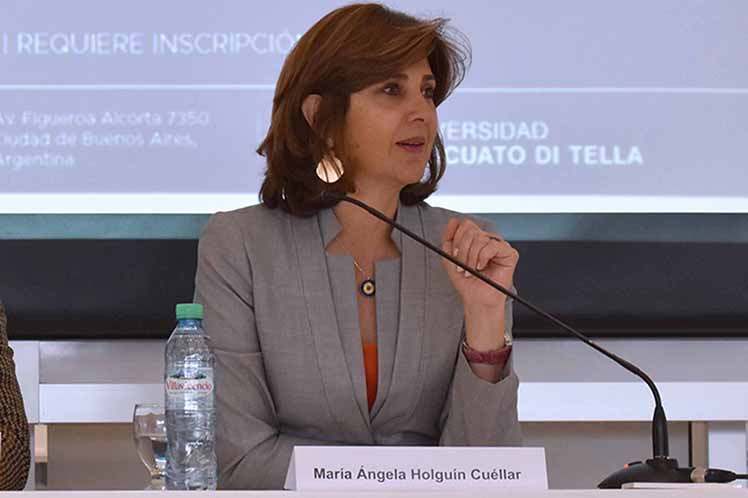 De visita oficial en Buenos Aires, la ministra de Relaciones Exteriores ofreció la víspera una sesión académica en la que abundó sobre el histórico acuerdo alcanzado con la guerrilla de las FARC-EP, durante casi cinco años de diálogos, que tuvieron como sede a Cuba, país garante junto a Noruega.
