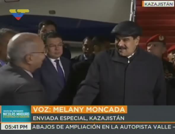 Aproximadamente a las 3 de la mañana del domingo, hora local de Kazajistán (5:30 pm del sábado, hora venezolana) arribó el avión con el Jefe de Estado venezolano, acompañado de su esposa, la Primera Combatiente y Constituyente Cilia Flores y una delegación de parlamentarios de la Asamblea Nacional Constituyente (ANC), encabezada por el presidente de la Comisión Internacional Constituyente, Adán Chávez.