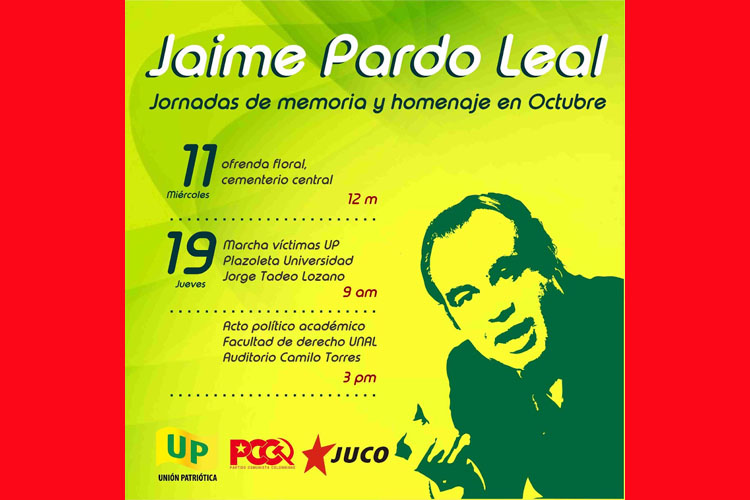 La dirección distrital del partido Unión Patriótica UP y del Comité Distrital del Partido Comunista PCC y la JUCO invitan a la ciudadanía de Bogotá y regiones vecinas a participar de los actos en homenaje al gran dirigente popular excandidato presidencial Jaime Pardo Leal con motivo de cumplirse 30 años del magnicidio cometido por fuerzas del Estado colombiano dentro del Genocidio cometido contra esta fuerza de la izquierda colombiana.