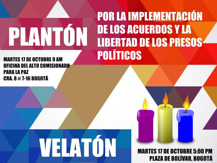 En Bogotá excombatientes de las FARC hoy integrados en el nuevo partido político Fuerza Alternativa del Común convocan a la ciudadanía para la realización de un plantón el día martes 17 de octubre a partir de las 9:00 am frente a la sede de la Oficina del Alto comisionado para la paz en la Carrera 8 No. 7-16 y una jornada de velatón a las 5:00 pm en la plaza de Bolívar para exigir total cumplimiento a lo acordado en la Mesa de La Habana y firmado en el Teatro Colón entre los negociadores de las partes.