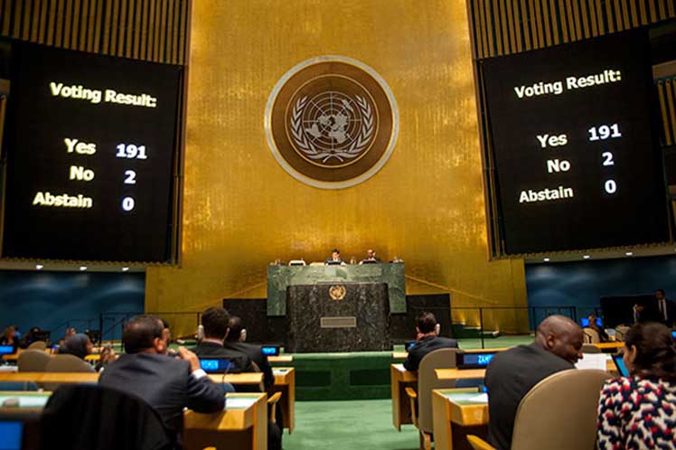 Naciones Unidas, 2 nov (PL) La Asamblea General de la ONU demandó por vigesimosexta ocasión consecutiva desde 1992 el fin del bloqueo contra Cuba, mediante una resolución apoyada por 191 países, que volvieron a dejar aislado a Estados Unidos con sus sanciones unilaterales.