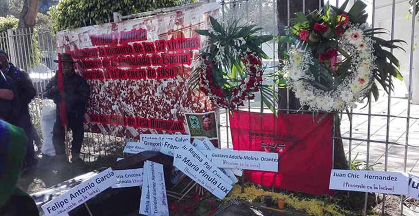 Representantes de pueblos indígenas y comunidades campesinas llegaron hasta la capitalina zona nueve, donde se encontraba la sede diplomática del país ibérico, con fotos de las 27 víctimas quemadas vivas ese día, y el reclamo al gobierno del presidente, Jimmy Morales, de impedir en un futuro delitos similares de lesa humanidad.