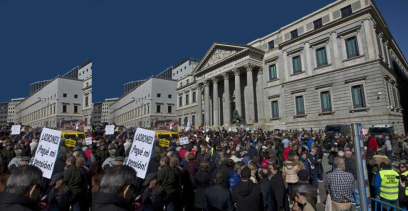 En Madrid, cerca de cuatro mil pensionistas se concentraron este jueves frente a la sede del Congreso de los Diputados para defender el sistema público de pensiones y denunciar lo que consideraron la pretensión del ejecutivo de Rajoy de privatizarlas.