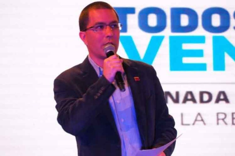 Al intervenir en el encuentro mundial de apoyo a la Revolución bolivariana Todos Somos Venezuela, que se desarrolla en el teatro Teresa Carreño, en Caracas, el ministro de Relaciones Exteriores agradeció la presencia de los cerca de 300 delegados extranjeros asistentes al evento.