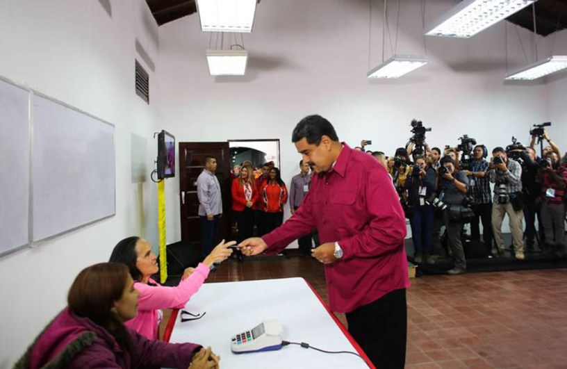 Una vez que ejerció su derecho al voto, Maduro saludó a los miembros de mesa y desde allí se dirigió a los medios de comunicación nacionales e internacionales para destacar que Venezuela celebra su derecho a elegir en democracia.