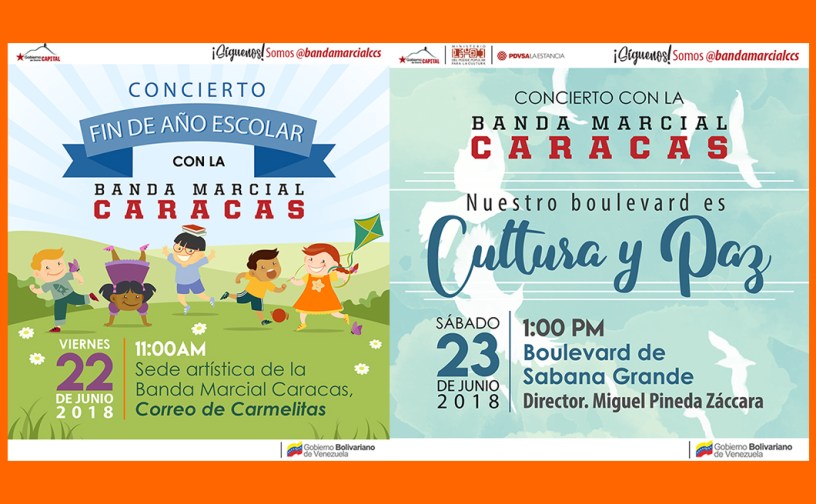 Para el día sábado 23 de junio a partir de la 1 de la tarde la Banda Marcial Caracas ofrecerá concierto gratuito a todos los transeúntes del Boulevard de Sabana Grande, denominado “Nuestro Boulevard es Cultura y Paz”, donde interpretarán obras entre las que destacarán “Bella Caracas”; “Fantasía para Banda Caracas”, del compositor Jhonny Quiroz; “Suite en Onda Nueva”, de Aldemaro Romero; “Ay mi tío”; “El chivo”; “Carmen la que contaba 16 años”, de Balbino García; entre otras.