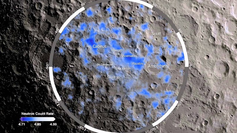 Luego en el 2009, el instrumento Moon Mineralogy Mapper (M3) de la Administración Nacional de la Aeronáutica y del Espacio (NASA), a bordo de la misión india Chandrayaan-1, encontró variaciones del contenido de hidrógeno y moléculas de agua en estado sólido en algunos cráteres del polo sur de la Luna.