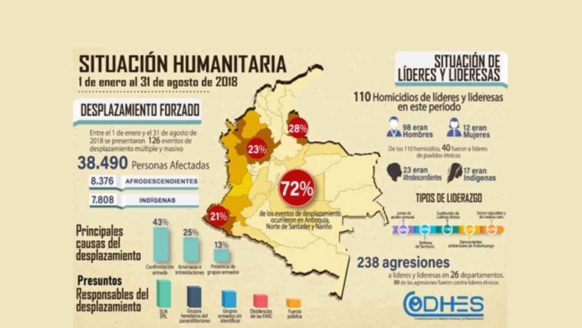 Desde enero hasta agosto del 2018 han sido asesinados 110 líderes sociales. 40 de estos asesinatos fueron contra líderes de Pueblos étnicos: 23 eran afrodescendientes y 17 indígenas.