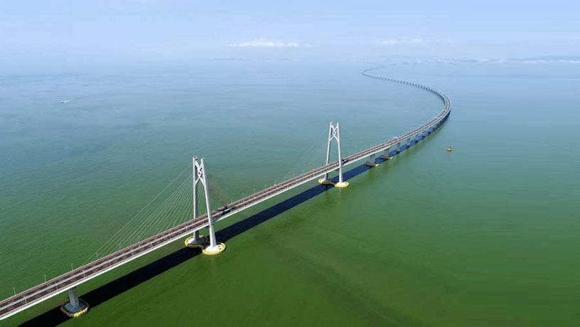 Tiene vida útil de 120 años, incluye un tramo de 29,6 kilómetros que cruza el río Perla; un puente de 22,9 kilómetros; un túnel de 6,7 kilómetros tendido a 40 metros bajo el lecho marino y algunas islas artificiales.