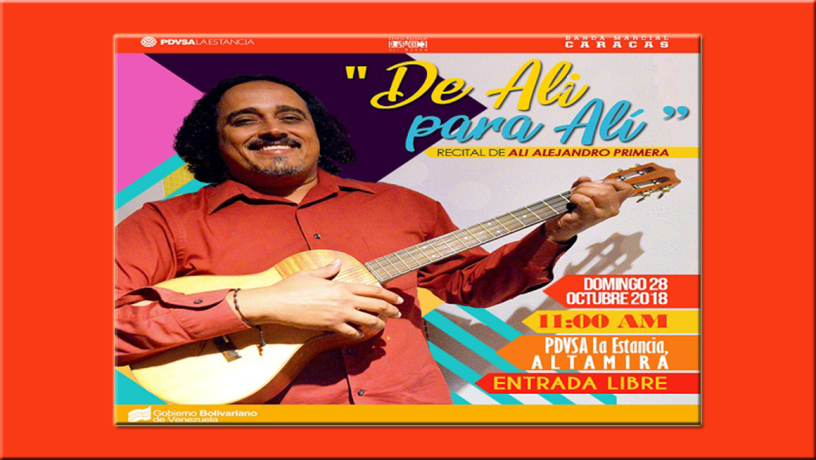 Caracas, 26 de octubre de 2018.- De Alí para Alí será el nombre del recital que ofrecerá el cantautor Alí Alejandro Primera este domingo 28 de octubre a partir de las 11:00 de la mañana en los espacios del brazo cultural de Petróleos de Venezuela S. A. en Altamira, Caracas.