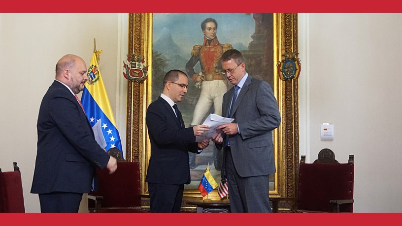 El ministro del Poder Popular para Relaciones Exteriores, Jorge Arreaza, entregó este jueves una nota de protesta al encargado de negocios de la embajada de Estados Unidos (EEUU), James Story, ante la denuncia realizada por el presidente de la República, Nicolás Maduro Moros, por los planes de golpe de Estado planificados por el gobierno norteamericano, así lo informó la Cancillería través de la red social Twitter.