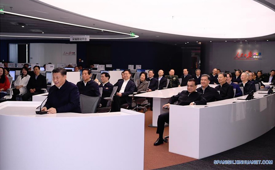 Xi Jinping, secretario general del Comité Central del Partido Comunista de China (PCCh), conversa en línea con un periodista y el primer secretario de una aldea de la provincia de Hebei, en el norte de China, sobre el trabajo de alivio de la pobreza en el People’s Daily, en Beijing, capital de China, el 25 de enero de 2019. Xi Jinping pidió el viernes esfuerzos para fomentar el desarrollo integrado de los medios de comunicación y fortalecer el tono dominante en la comunicación pública, con el fin de consolidar la base teórica común de unirse y trabajar duro en una sesión colectiva de estudio del Buró Político del Comité Central del PCCh el viernes en el People’s Daily. (Xinhua/Yan Yan)