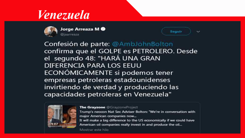 Caracas, 30 ene (PL) El consejero de Seguridad Nacional del Gobierno de Estados Unidos, John Bolton, confirmó que el golpe de Estado ejecutado en Venezuela es para apropiarse del petróleo, alertó hoy el canciller de la República, Jorge Arreaza.