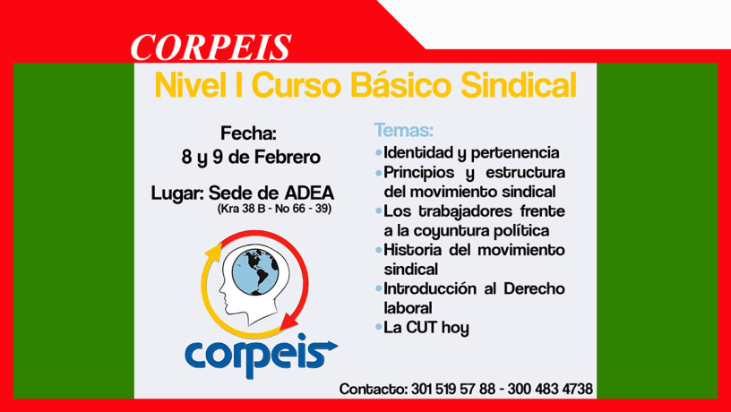 La Corporación Para el Desarrollo de la Educación y la Investigación Social CORPEIS adelantará en la ciudad de Barranquilla el Nivel I del Curso Básico Sindical. El evento de formación de la clase trabajadora será en la Sede de la ADEA, Carrera 38 No 66- 39 durante los días viernes 8 y sábado 9 de febrero de 2019.