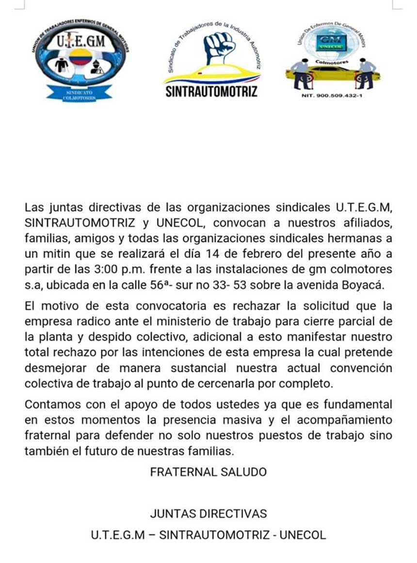 Las organizaciones sindicales UTEGM y SINTRAUTOMOTRIZ, y la federación de trabajadores enfermos UNECOL invitan al conjunto de organizaciones sociales de la ciudad capital y ciudadanía en general para que participen en el mitin contra la amenaza de despidos de trabajadores y cierre parcial en la compañía General Motors GM Colmotores.