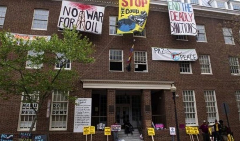 Code Pink recordó que están dentro de la embajada, con permiso de diplomáticos venezolanos, “para protegerla de la toma de control por parte de las fuerzas de la oposición (venezolana), como parte del golpe de Estado orquestado por EEUU.”