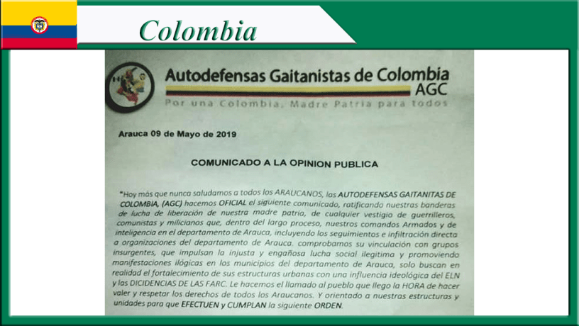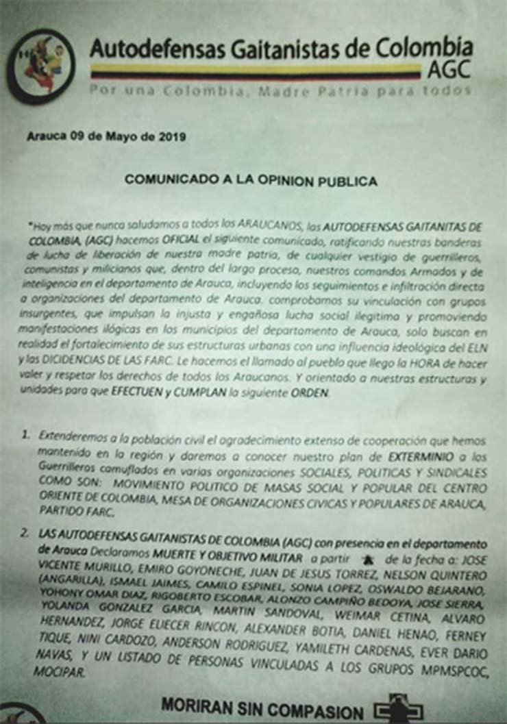 2- A pesar de la alta militarización que se registra, una de las más rigurosas del país, en el departamento de Arauca la inseguridad para la población, sus organizaciones cívicas, sociales y líderes sociales se ha incrementado, con el acelerado número de muertes selectivas, los taponamientos de vías por grupos armados, los robos, atracos, extorsiones, detenciones arbitrarias, amenazas a periodistas y a la dirigencia popular, como las realizadas en un panfleto por las supuestas “Autodefensas Gaitanistas de Colombia -AGC”, que apareció en Saravena y circuló por redes sociales el 11 de mayo.