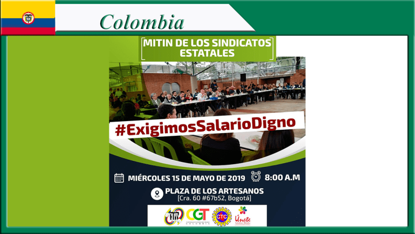 Bogotá, 14 de mayo de 2019. Las Centrales Sindicales CUT, CGT y CTC y la Federación Sindical Unete, convocan para este miércoles 15 de mayo a un mitin en apoyo a la negociación salarial de los trabajadores estatales quienes proponen un aumento de 7 puntos por encima del IPC.