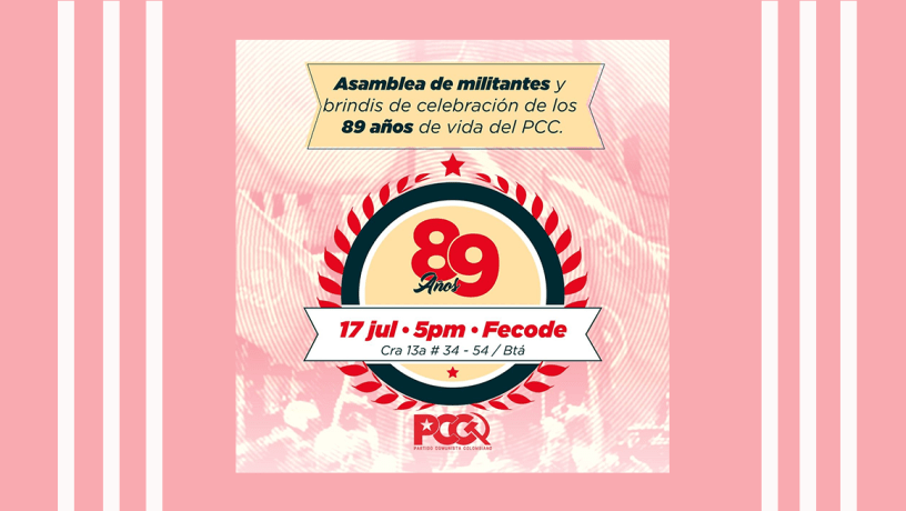 La dirección ejecutiva del Comité Distrital “Mario Upegui Hurtado” del Partido Comunista Colombiano PCC invita a la militancia y seguidores de la ciudad capital a participar este miércoles 17 de Julio a partir de las 5:00 de la tarde en la asamblea general y brindis de celebración de los 89 años de vida del partido en el auditorio de la Federación Colombiana de Educadores FECODE, ubicada en la Carrera 13 A N° 34-54 Teusaquillo.