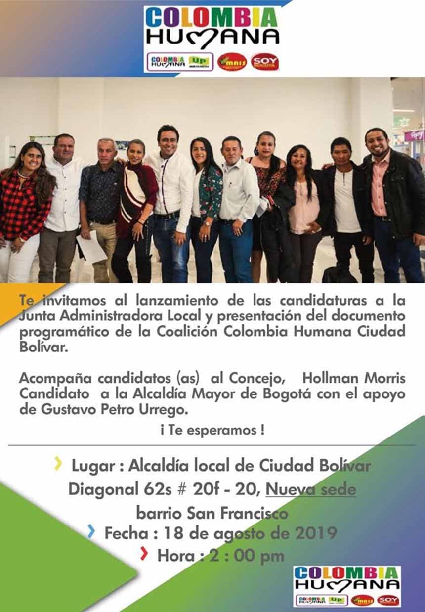 La Convergencia de las fuerzas políticas y sociales Colombia Humana-UP, Maís y Soy Bogotá de la localidad 19 de Ciudad Bolivar invitan a la ciudadanía de este territorio al acto de lanzamiento de las candidaturas a la Junta Administradora Local JAL previsto para el día domingo 18 de agosto a partir de las 2:00 de la tarde en el barrio San Francisco, frente a la nueva sede de la Alcaldía Local.