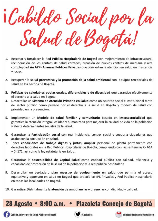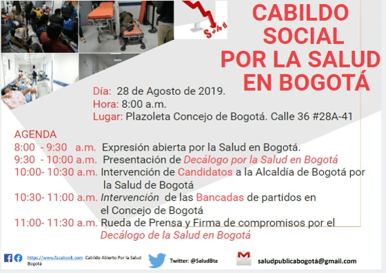 Desde el Movimiento Nacional por la Salud y Seguridad en Bogotá se viene convocando a un Cabildo Social por la Salud para el dia miercoles 28 de agosto de 2019 a partir de las 8:00 de la mañana en la PLazoleta delConcejo Distrital, debido a la profunda crisis del sector Salud de la ciudad que se evidencia con: