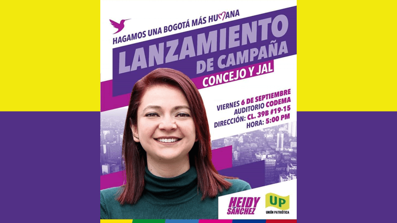 Este viernes 6 de septiembre será el acto público de presentación y lanzamiento de la Campaña del partido UP -Colombia Humana en cabeza de Heidy Sanchez Barreto al Concejo de Bogotá y listas a las Juntas Administradoras Locales JAL. El encuentro tendrá lugar a partir de las 5:00 de la tarde en el Auditorio de la Cooperativa del Magisterio CODEMA, calle 39 No. 19-15.