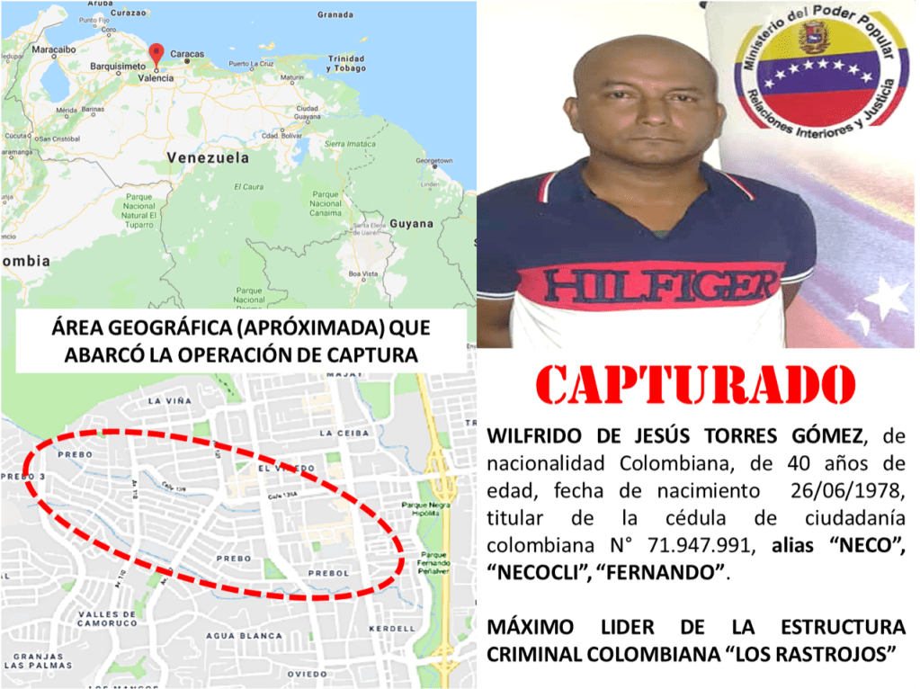 Una vasta operación de inteligencia que peinó cada centímetro de la frontera colombo-venezolana durante más de seis meses permitió al Ministerio de Relaciones Interiores Justicia y Paz del Gobierno bolivariano dar con el paradero de Wilfredo de Jesús Torres Gómez, alias Necoclí, máximo líder de la banda paramilitar colombiana Los Rastrojos.  Su aprehensión, supone un paso importante para desarticular lo que a juicio de Freddy Bernal, miembro de la dirección nacional del Partido Socialista Unido de Venezuela y Protector presidencial para el estado Táchira, es la amenaza más grande de la región.