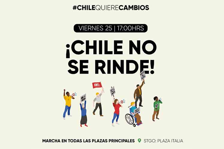 Santiago de Chile, 25 oct (Prensa Latina) La Central Unitaria de Trabajadores (CUT) de Chile convocó para hoy a una nueva jornada de protestas contra el modelo neoliberal existente en el país y la ola represiva ordenada por el Gobierno de Sebastián Piñera.