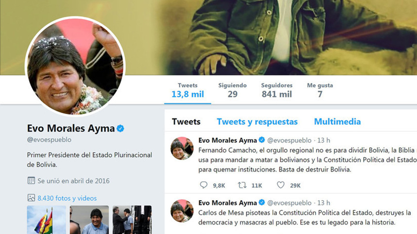 Ya en México, país en el que se encuentra desde el martes como asilado político, Evo Morales, el mandatario depuesto de Bolivia, cambió su perfil de Twitter, donde ahora se define como «Primer Presidente del Estado Plurinacional de Bolivia».