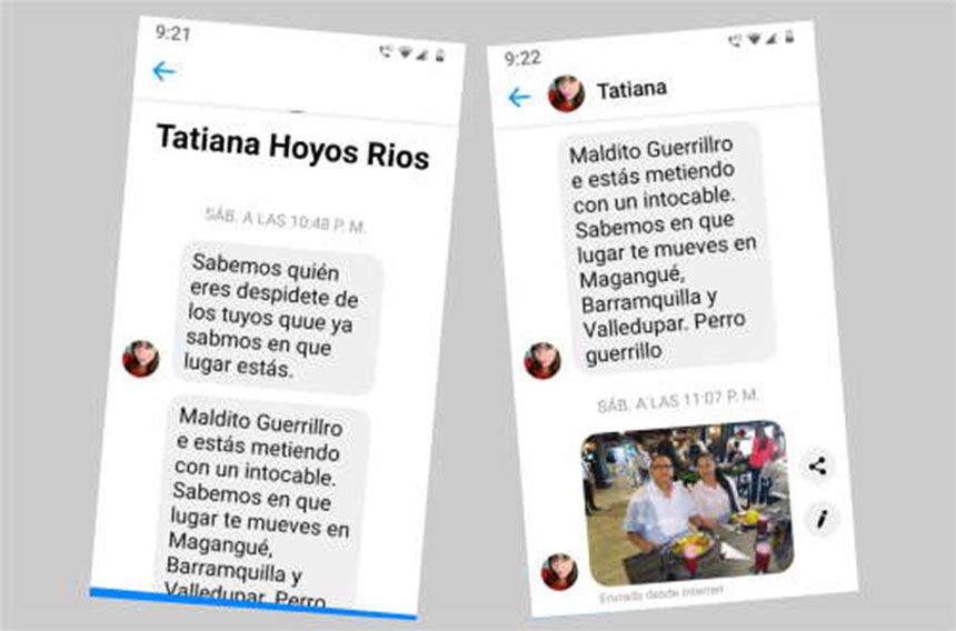 El mensaje decía “‘Sabemos quién eres, despídete de los tuyos, que ya sabernos en qué lugar estás. Maldito guerrillero, te estás metiendo con un intocable. Sabemos en qué lugar te mueves: Magangué, Barranquilla, Valledupar. Perro guerrillero