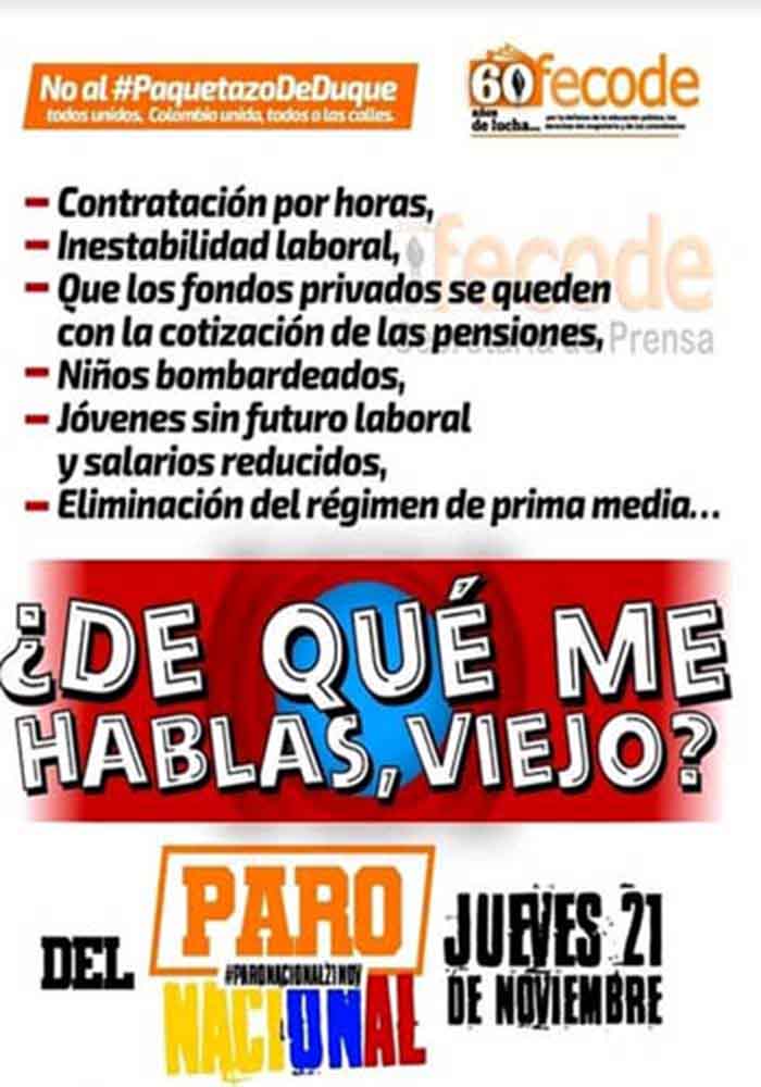 Vélez hacía referencia, claro está, al paro de este jueves, convocado por las fuerzas vivas del movimiento popular ante el paquetazo de medidas laborales, pensionales y tributarias que Duque nos quiere imponer por orden del FMI, Álvaro Uribe y la OCDE.