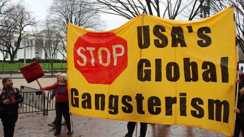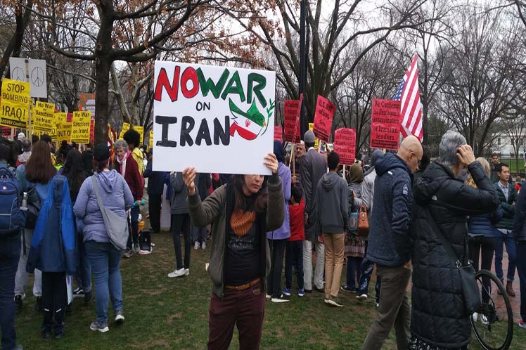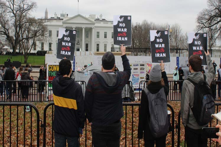 FotosPL: Diony Sanabia Washington, 4 ene (Prensa Latina) Gritos de ‘No a la guerra con Irán’ y ‘Estados Unidos fuera del Medio Oriente’ se escucharon hoy en decenas de ciudades norteamericanas ante las crecientes tensiones con el país persa.