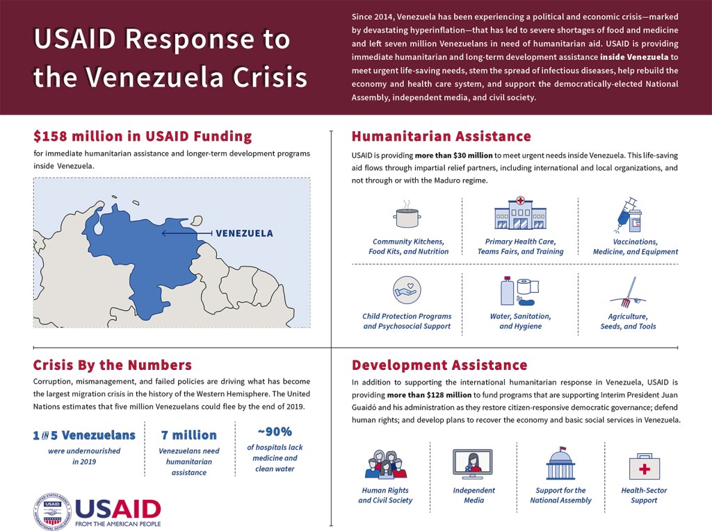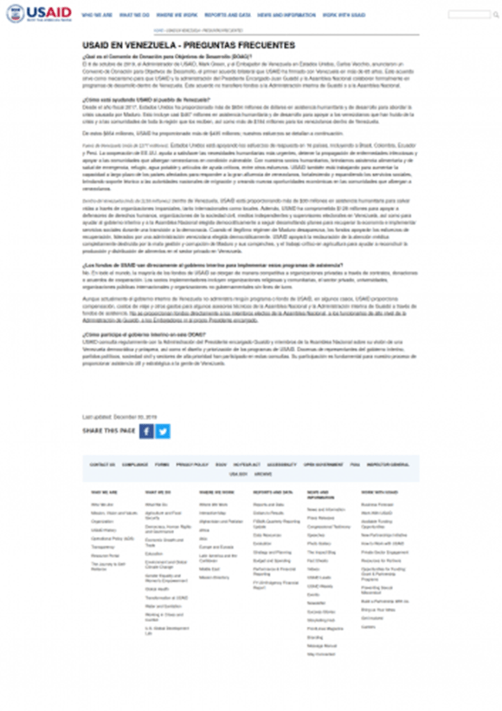 15 Enero 2020 – En documentos publicados en su sitio web oficial, la Agencia de los Estados Unidos para el Desarrollo Internacional (Usaid, ente delgobierno estadounidense que recibe lineamientos del Departamento de Estado) admitió haber entregado casi 467 millones de dólares en «asistencia humanitaria y de desarrollo» para Venezuela, supuestamente para atender los problemas que ocurren en el país. 128 millones de dólares han sido entregados a programas propuestos por el diputado Juan Guaidó, quien es considerado por la administración Trump como supuesto «presidente encargado» de Venezuela.