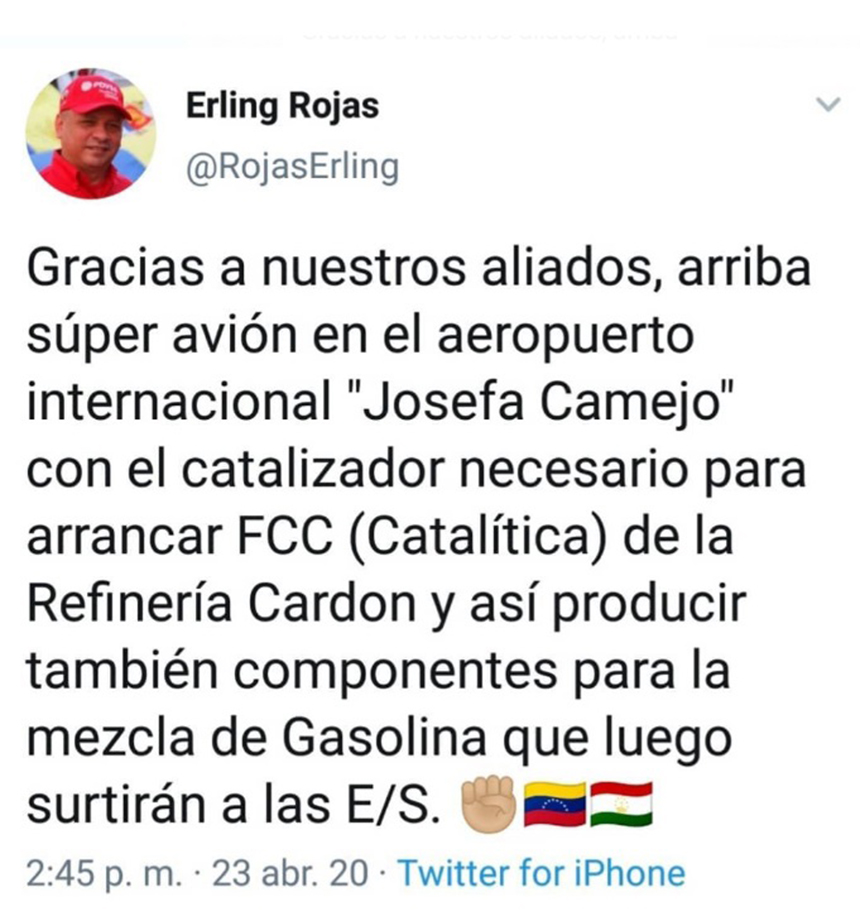 «Gracias a nuestros aliados, arriba súper avión en el aeropuerto internacional Josefa Camejo con el catalizador necesario para arrancar FCC (Catalítica) de la Refinería Cardón y así producir también componentes para la mezcla de gasolina que luego surtirán las E/S (estaciones de servicio)», escribió en su cuenta, @RojasErling, acompañando el mensaje con las banderas de Venezuela e Irán.