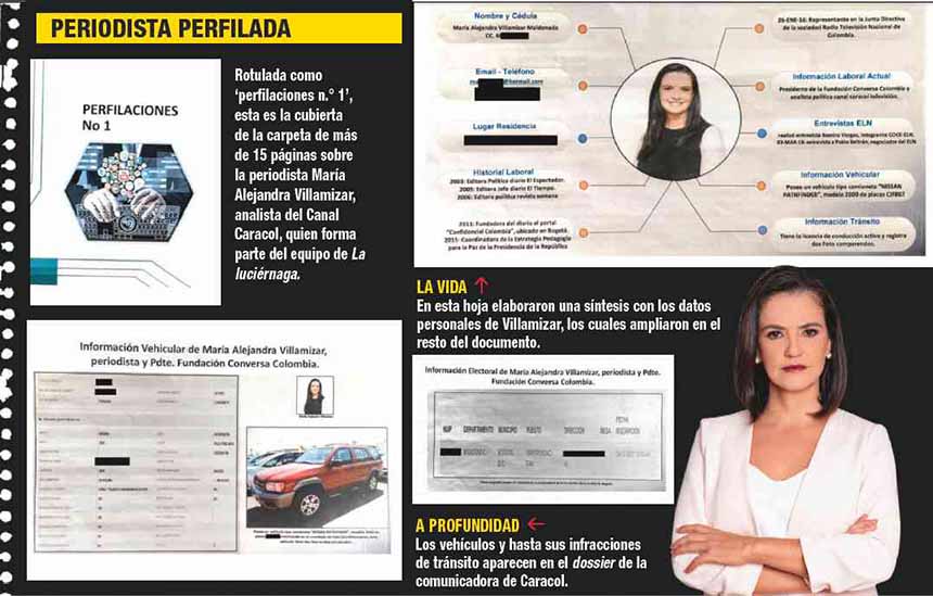 Los comunicadores nacionales tampoco se escaparon de formar parte de esas polémicas carpetas militares. Una de ellas, María Alejandra Villamizar, actualmente es analista de Noticias Caracol y hace parte del equipo periodístico de La luciérnaga. Con más de 25 años de carrera, ha sido editora política de El Espectador, El Tiempo y SEMANA, así como asesora de comunicaciones en temas de paz en los Gobiernos de Samper, Pastrana y Santos. A lo largo de 12 páginas los militares recaudaron sus teléfonos, dirección, correos, vehículos, el lugar en donde vota y hasta las infracciones de tránsito que cometió. También aparecen las reseñas de las entrevistas que realizó el año pasado a jefes del ELN, transmitidas en el noticiero para el que trabaja desde hace dos años.
