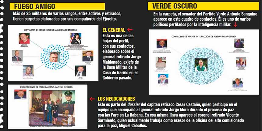 El general retirado Jorge Maldonado, exjefe de la casa militar de Palacio en el Gobierno pasado; el general retirado Carlos Lemus, actual segundo de la Justicia Penal Militar; el general retirado Juan Pablo Amaya Kerguelen, hermano del actual director de la DNI, y el exdirector de Indumil, coronel retirado Enrique Villarreal, hacen parte de los más de 25 militares que tienen carpetas y perfiles.