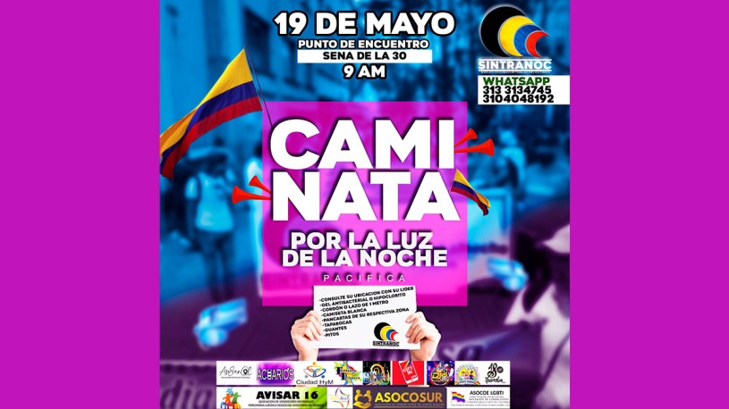 Para el día martes 19 mayo desde las 9:00 A.M en el SENA de la carrera 30 en Bogotá se ha convocado a una masiva movilización de los trabajadores y comerciantes de establecimientos nocturnos, en la cual, según los organizadores se aplicarán las medidas de protección y seguridad personal como el uso de tapabocas y distancia entre persona y persona. También extienden invitación a la ciudadanía y demás sectores sociales para el acompañamiento y participación.