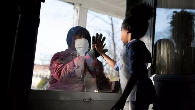 Un profesional sanitario saluda a su hija a través del vidrio para no exponerla al Covid-19 en Nueva York, Estados Unidos, el 11 de abril de 2020. Foto: Joy Malone / Reuters