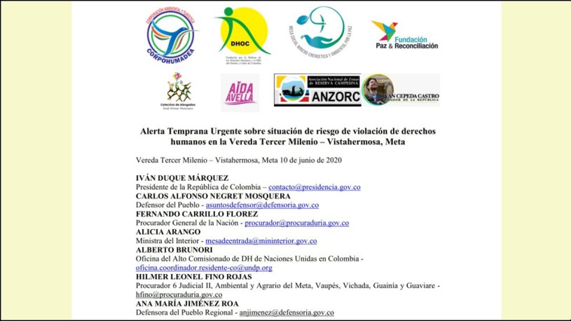 Durante los días 26 de mayo y 05 de junio del año en curso en la Vereda Tercer Milenio del municipio de Vistahermosa en el Dpto. del Meta, se presentaron situaciones de grave vulneración a los derechos humanos sobre la población que allí se encuentra.