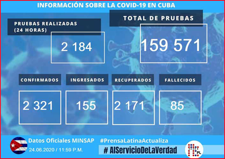 La Habana, 25 jun (Prensa Latina) Autoridades del Ministerio de Salud Pública (Minsap) informaron hoy que dos personas dieron positivo a la Covid-19, con lo cual suman dos mil 321 los casos confirmados, sin reportes de fallecidos por séptimo día consecutivo.