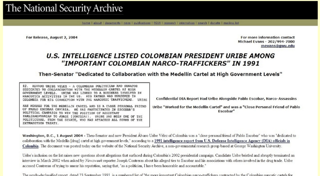 “El documento es la primera evidencia desclasificada referida a los presuntos vínculos de Uribe con los paramilitares que llega a los más altos niveles del Departamento de Defensa”, difundió el NSA en su página web.