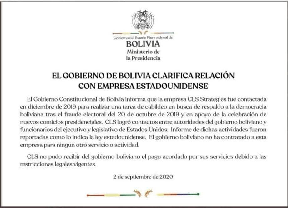 La empresa de Mark Zuckerberg, “detectó y removió de su plataforma y de Instagram una red de cuentas que recurrían a conductas de desinformación cuyo fin era favorecer, entre otros, al Gobierno interino de Bolivia, con una inversión millonaria” … “Se trata de 55 cuentas de Facebook, 42 páginas y 36 cuentas de Instagram, operadas desde Estados Unidos, que violaron la política de Facebook contra la injerencia extranjera y de comportamiento inauténtico coordinado” … “esta red de desinformación tiene lazos con CLS Strategies, una firma de comunicación estratégica basada en Estados Unidos” … “en Facebook cerca de 509.000 cuentas seguían una o más de estas Páginas investigadas, mientras que cerca de 43.000 personas seguían una o más de las cuentas de Instagram”