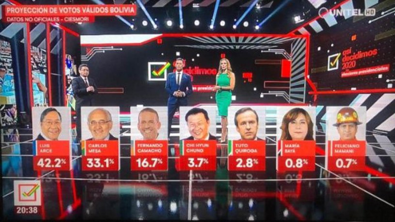 En el último día permitido por las autoridades electorales bolivianas para la difusión de encuestas, los canales privados Unitel y Bolivisión difundieron en programas nocturnos un estudio realizado por la empresa Ciesmori.
