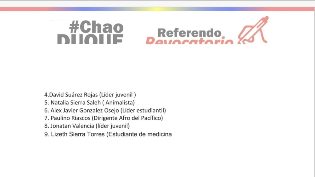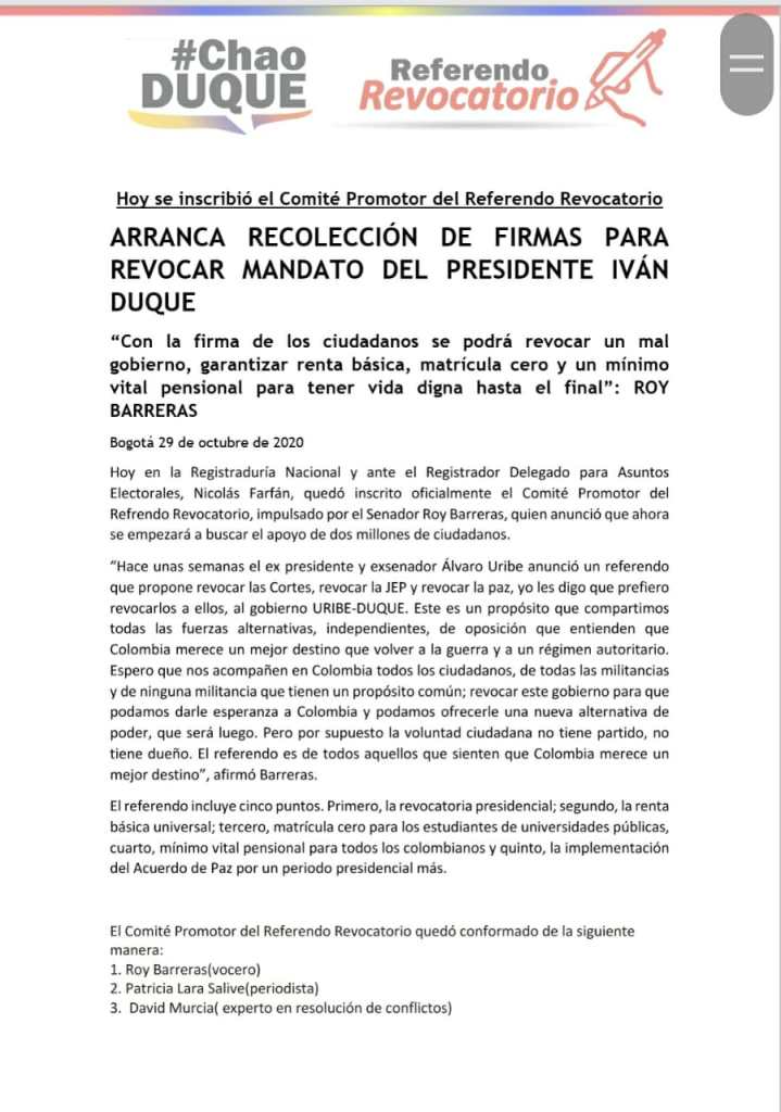 “Iniciaremos el proceso de este referendo con el cual haremos posible la revocatoria presidencial, la renta básica universal, la matricula cero para los estudiantes universitarios y el mínimo vital pensional para todos los colombianos”